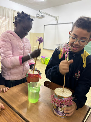 Los alumnos de 6º actuaron como mentores, ayudando a los más pequeños a tocar y descubrir distintos tipos de instrumentos de percusión. Pero los más pequeños también les mostraron la zambomba que les trajo la señorita Z y les enseñaron a tocarla.